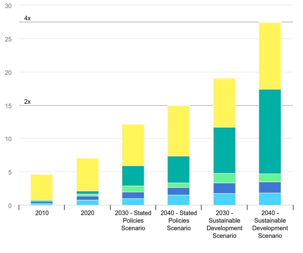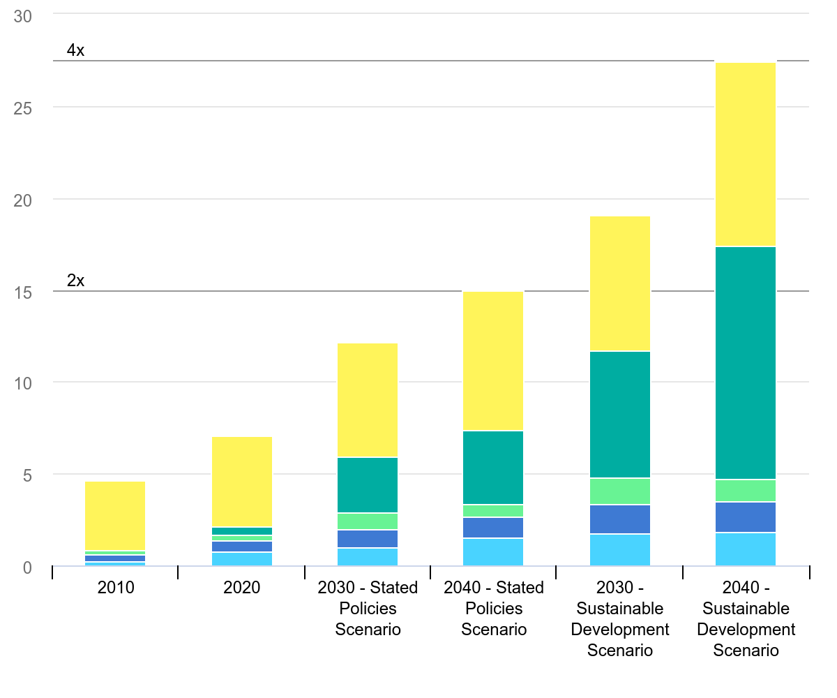 Total mineral demand for clean energy technologies by scenario, 2010-2040